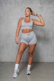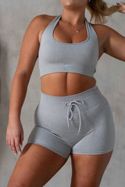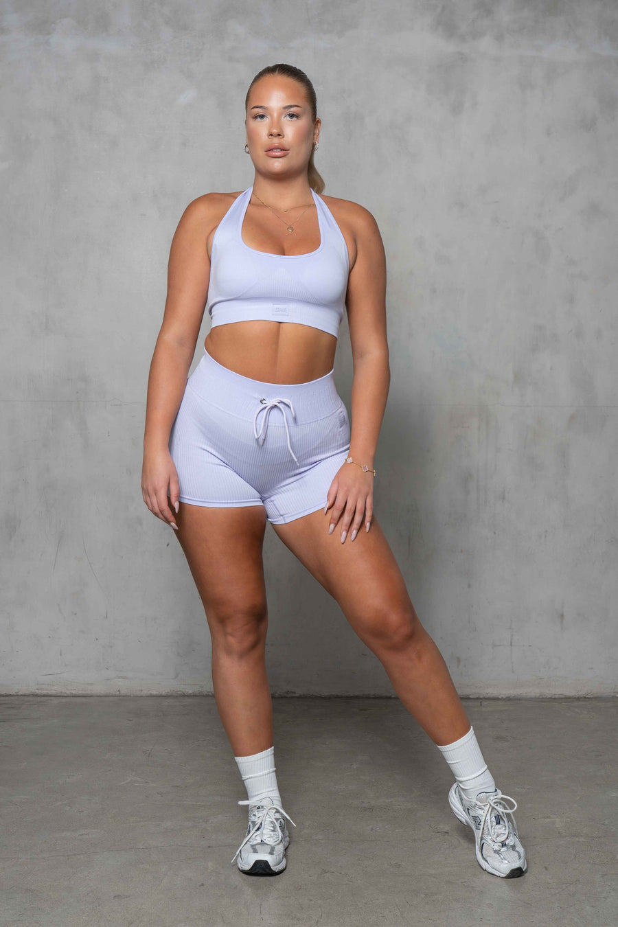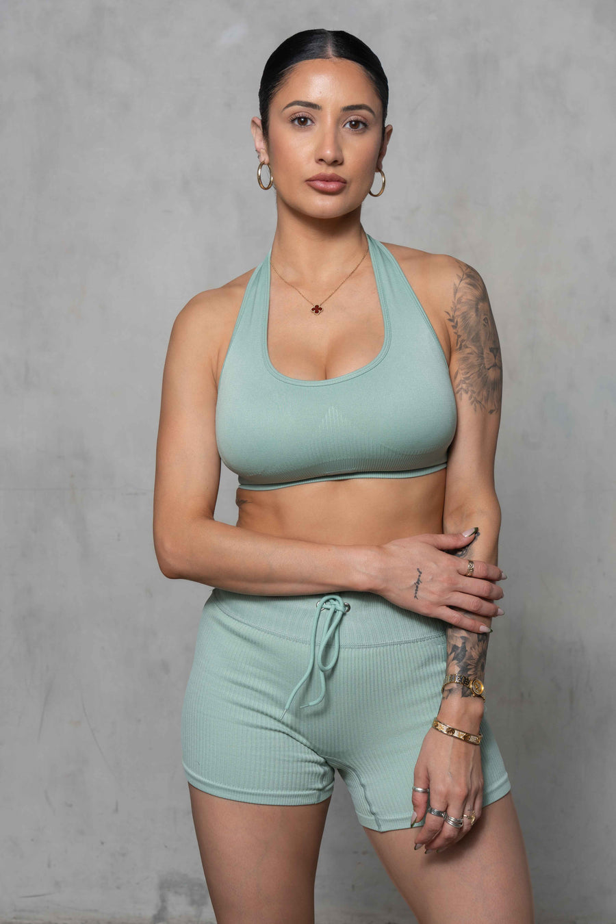 This bra features ribbed texture and a halter neckline, with a front center patch.