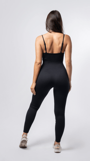 This active jumpsuit features seamless construction, all-over ribbing, scoop neckline, sleeveless cut, and SMR detailing.