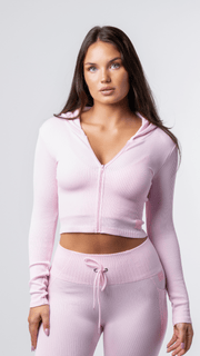 This top features seamless construction, all-over ribbing, long sleeves, mock neckline, zip-up front, and cropped hem.