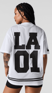 This jersey features mesh material, graphics, V-neckline, and short sleeves.