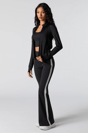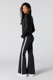 This pant features soft material, all-over ribbing, elastic waist, and flare leg.