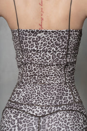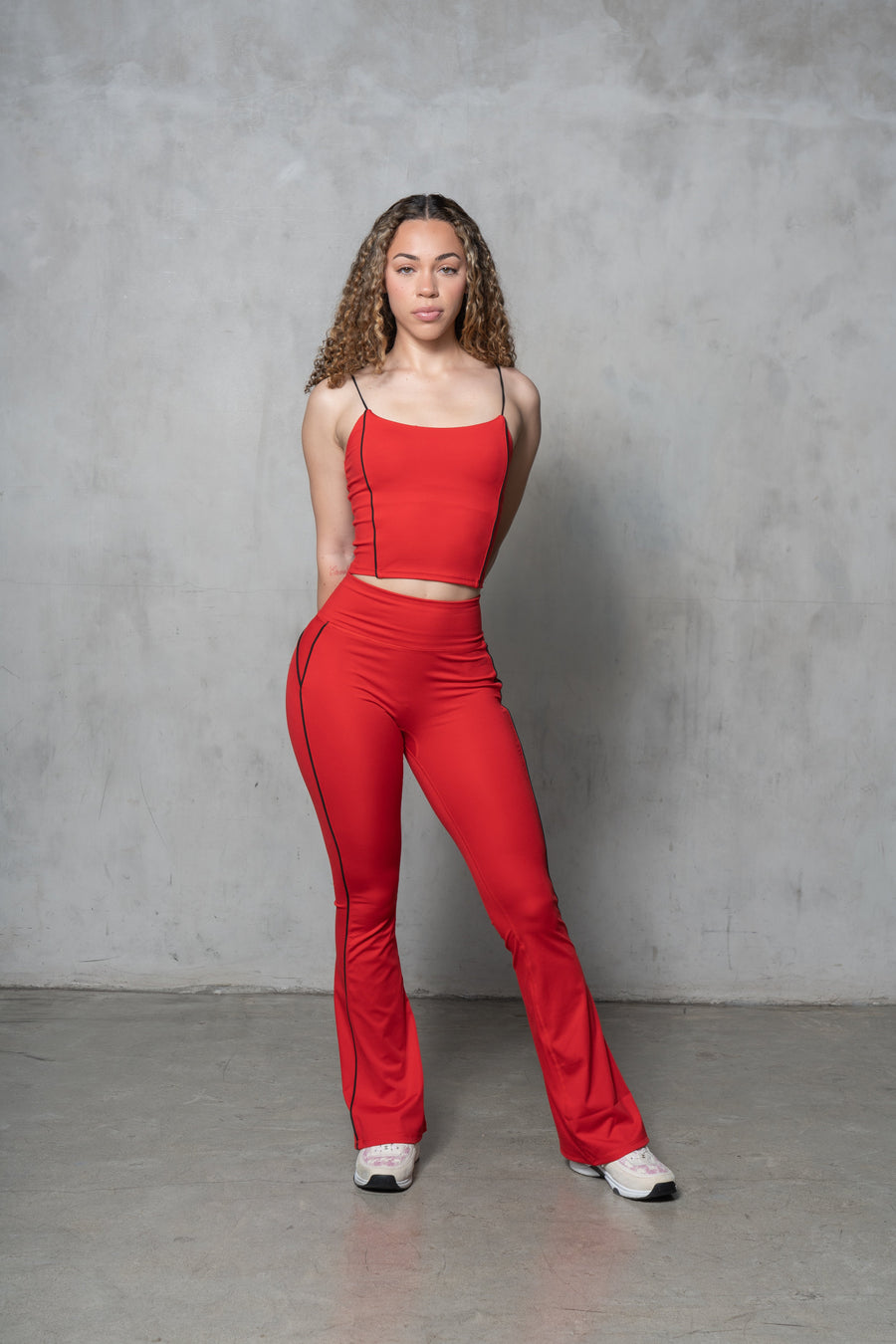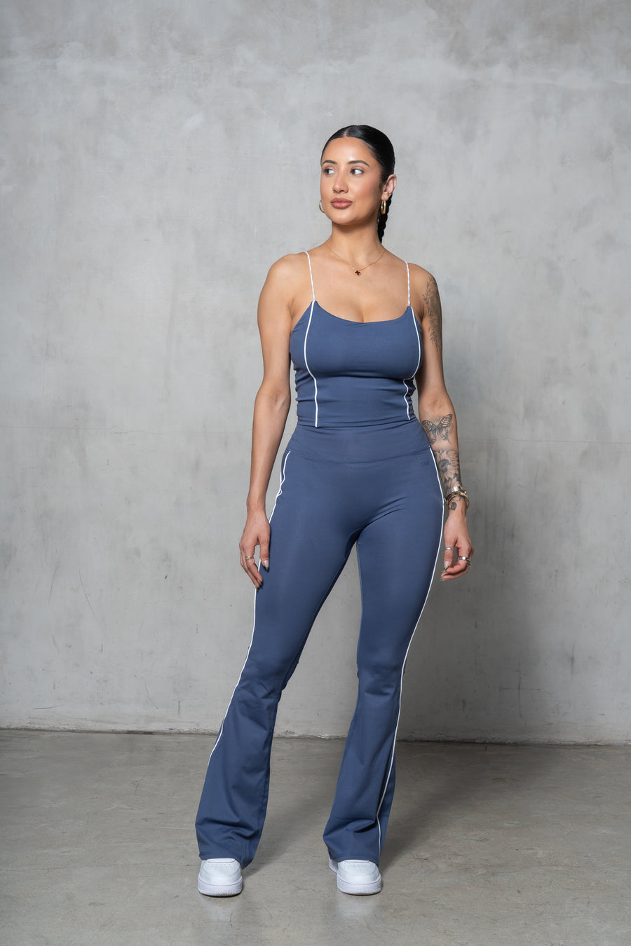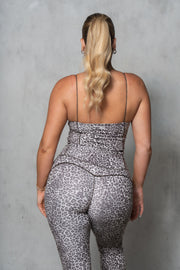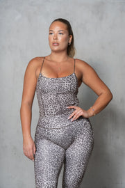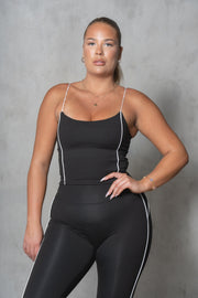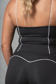 This active top features scoop neck, contrast piping, and bungee straps.